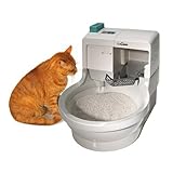 Never scoop, touch, buy, or change cat litter again with this unique self-flushing, self-washing cat box. Instead of traditional litter, it uses permanent washable granules that never require changing, yet satisfy a cat's need to dig and cover. Liquids drain through the granules and solid waste gets scooped and liquefied, then both are flushed with fresh water down the drain. Touch a button or pre-set the timer to start the wash cycle. Using water and veterinarian-approved SaniSolution, the unit scours and sanitizes the granules and cat-box interior to eliminate germs and odors. Its built-in dryer completes the cycle by blowing hot air over the granules to dry them. The unit acts like a cat box, washes and dries like an appliance, and flushes waste out of the home like a toilet.
